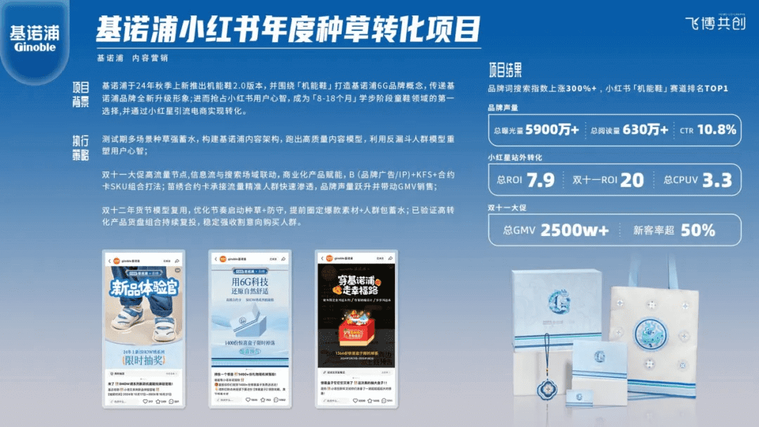 在内容营销实践中,飞博共创以创新策略为品牌打造众多标杆案例。2024 年,童鞋品牌基诺浦推出机能鞋 2.0 版本,飞博共创创新采用 B + KFS 组合打法与反漏斗人群模型,通过多场景种草内容为双十一活动蓄水。双十一期间,进一步联动信息流与搜索场域,结合惊喜盒子投放实现千万级曝光,推动品牌关键词搜索指数暴涨超 300 %,成功打造“基诺浦 6G 机能鞋”爆款概念。最终通过小红星引流电商实现 ROI 最大化,双十一站内转化 GMV 超 2600 万,淘宝尾款峰值 GMV 突破 800 万,ROI 转化比超 5 倍,新客率达 50 %以上,助力品牌在童鞋赛道热度超越竞品跃居 TOP1 。